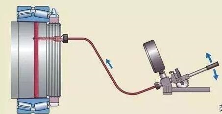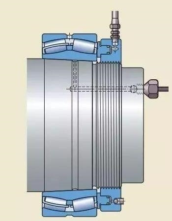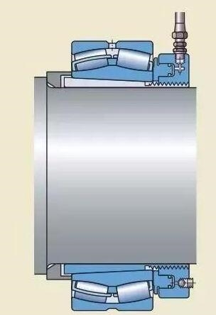 注油法的工作原理是:液压油在高压下通过油孔和油槽,注入轴承和轴径之间的配合面,形成一层油膜。油膜将配合面分开,使得配合面之间的摩擦大幅减少。这种方法通常用于直接把轴承安装在圆锥形轴径上的情况。必须的油孔和油槽应是整体轴设计的一部分。如果紧定套和退卸套,已加工有油孔油槽,这种方法也可用于将轴承安装在紧定套或退卸套上。