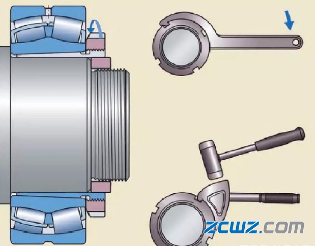 对于中小型轴承,可以利用锁紧螺母、钩形扳手或冲击扳手来进行拆卸(下图)。