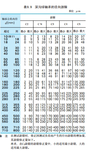 看图表9.9,在内部游隙中,普通游隙值适用于一般工况,以此为基础,小的一侧按C2.C1的顺子减少。大的一侧C3.C4.C5的顺序增大。