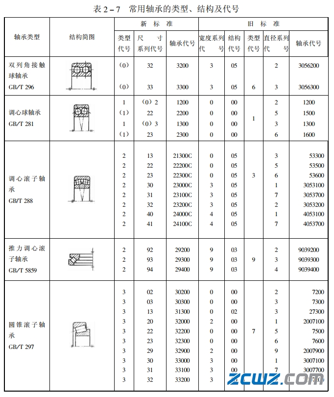 尺寸系列代号由轴承的宽(高)度系列代号和直径系列代号组合而成。向心轴承、推力轴承尺寸系列代号见表2-2。向心轴承、推力轴承尺寸系列新旧代号对照见表2-3和表2一4。