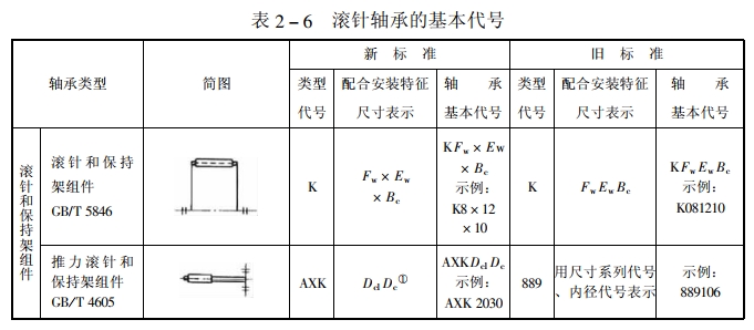 滚针轴承基本代号由轴承类型代号和表示轴承配合安装特征的尺寸构成。类型代号用字母表示,表示轴承配合安装特征的尺寸,用尺寸系列、内径代号或者直接用毫米数表示。类型代号和表示配合安装特征尺寸的轴承基本代号见表2一6。